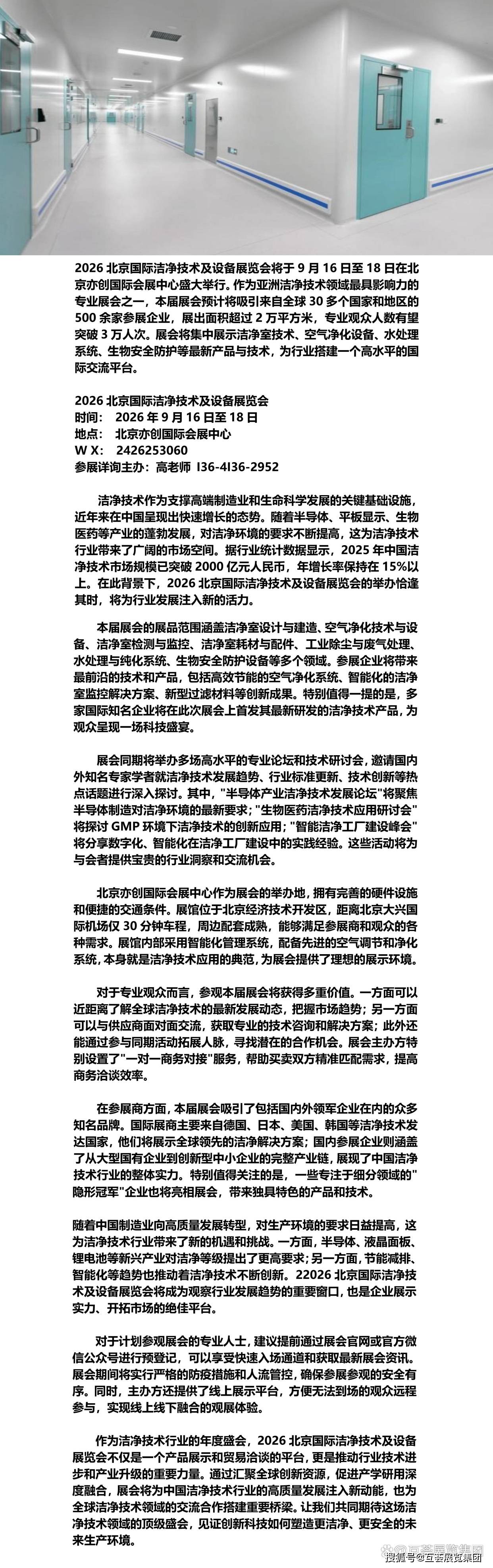 展会选址亦创国际会展核心,该场馆是南部地域主要的专业会展分析体,交通便当,设备一流。坐落于京津冀协同成长的焦点区域,可以或许无效辐射并吸引来自全国,出格是环渤海经济圈的强大高端制制、为展商取专业买家的高效对接创制绝佳前提。 本届展会的承办方——上海互荟展览办事无限公司,是一家正在专业展览范畴具有丰硕经验和杰出口碑的展览机构。凭仗其专业的市场运做能力、复杂的数据库资本和精细化的办事,互荟展览将全力保障展会的组织筹备、宣传推广、不雅众邀请及现场办事工做,确保为所有参展商、专业不雅众及合做伙伴供给高效、便利、高质量的一坐式参展不雅展体验,最大化提拔参展价值。 展会估计展览面积将达数万平方米,吸引跨越500家国表里出名企业参展。展品范畴将全面涵盖干净室手艺取设备、空气净化取过滤手艺、干净监测取节制系统、无菌隔离安拆、干净材料取耗材、清洗取灭菌设备等焦点范畴。同时,将出格设立专区,沉点展现正在半导体系体例制、生物医药研发取出产、数据核心、细密仪器、医疗卫朝气构等高端使用场景下的立异处理方案,呈现干净手艺若何做为底层支持,驱动计谋性新兴财产的升级取变化。 目前,2026国际干净手艺设备博览会的各项筹备工做已全面启动。我们诚挚邀请全球干净手艺范畴的专家学者、企业代表、专业买家及伴侣届时拨冗莅临,联袂干净手艺财产的立异,配合摸索将来成长的无限可能! 为深化展会内涵,推进产学研用深度融合,展会期间将同步举办多场高规格从题论坛和手艺研讨会。论坛将邀请相关部分带领、两院院士、行业协会专家、国表里顶尖企业手艺担任人等分量级嘉宾,环绕“双碳”方针下的干净手艺成长、智能制制中的干净保障、生物平安法实施取干净尺度升级、聪慧干净工场扶植等行业热点取前沿议题展开深度切磋,分享最新研究取实践案例。 “2026国际干净手艺设备博览会”,将于2026年9月16日至18日正在亦创国际会展核心隆沉举行。本届展由业内出名的上海互荟展览办事无限公司全程筹谋并承办,旨正在打制一个集手艺展现、学术交换、全面鞭策干净手艺财产链的协同立异取高质量成长。